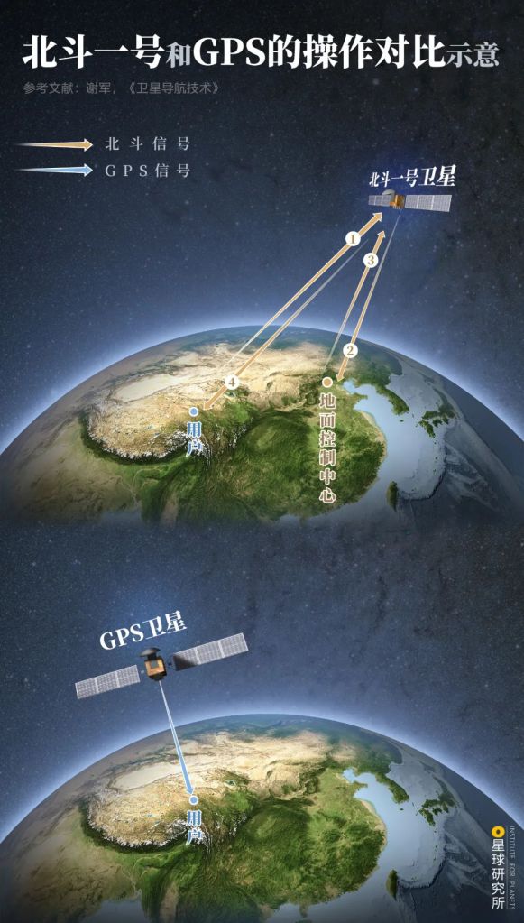 BeiDou-1 (北斗一号卫星), ground station (地面控制中心), user (用户)