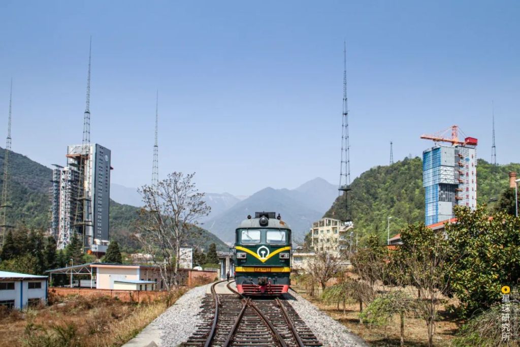The two launch towers and an operating rocket transport locomotive at Xichang Satellite Launch Centre