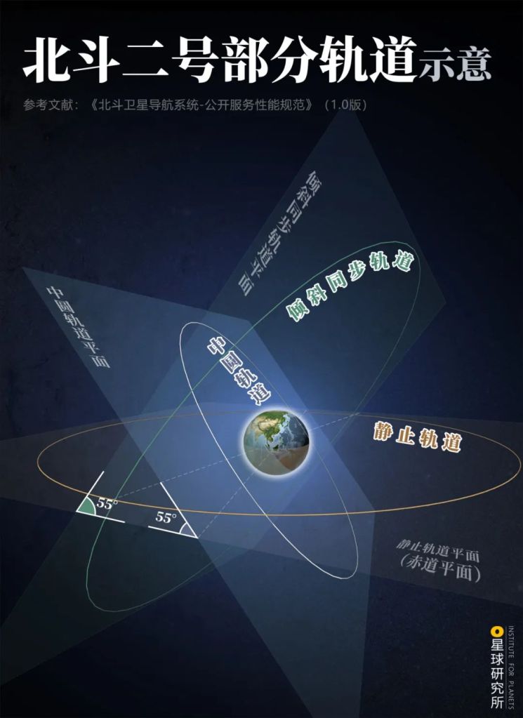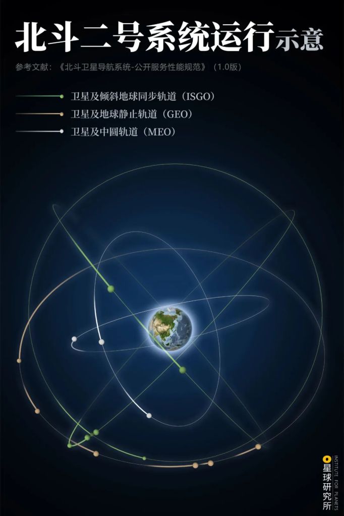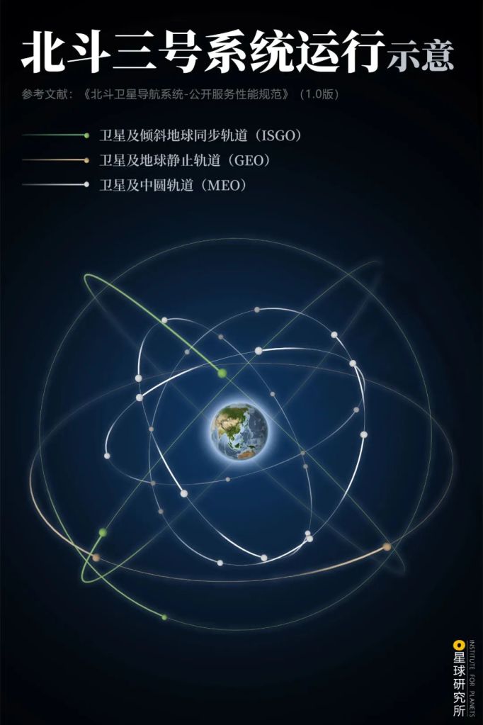 Inclined geosychronous orbit, IGSO (倾斜地球同步轨道); geosynchronous equatorial orbit, GEO (地球静止轨道); medium Earth orbit, MEO (中圆轨道)