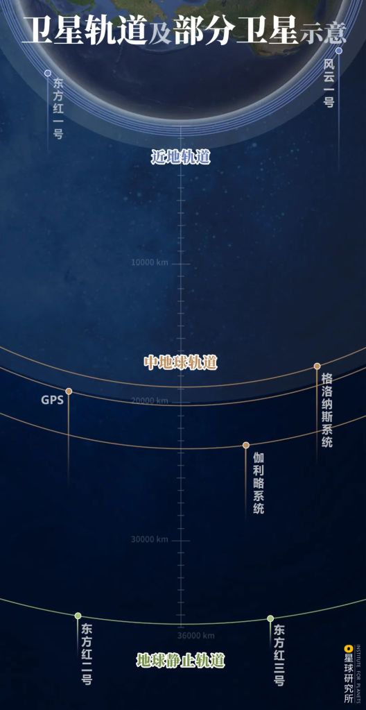 Low Earth orbit, LEO (近地轨道); medium Earth orbit, MEO (中地球轨道); geosynchronous equatorial orbit, GEO (地球静止轨道)