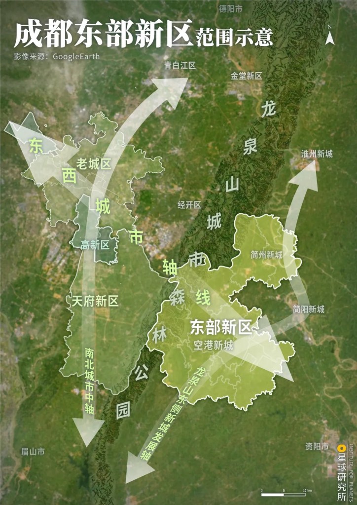 In March 2018, the draft of Comprehensive Urban Plan of Chengdu City (2016-2035) was made public. According to the plan, Chengdu’s urban development would shift eastwards and beyond the Longquan Mountain. This would completely overturn the “one city contained by two mountains” geographical outlook which have persisted for a millennium, and reshape it into a “two-winged city across a mountain“.