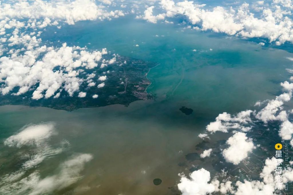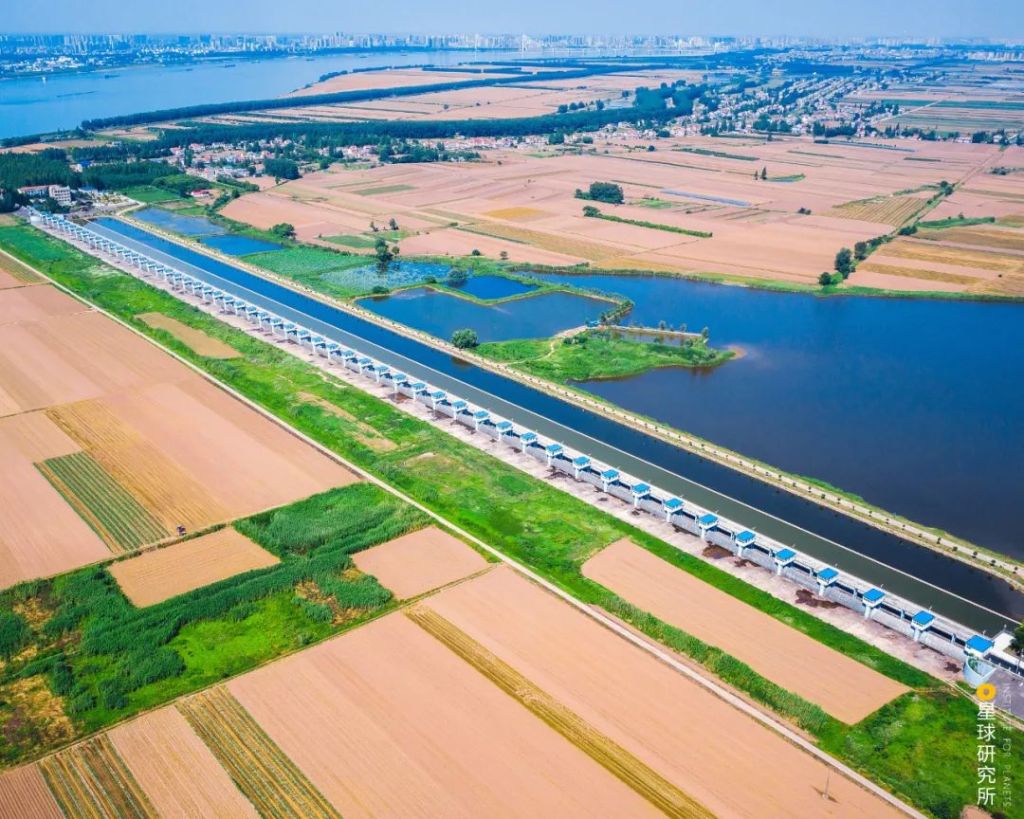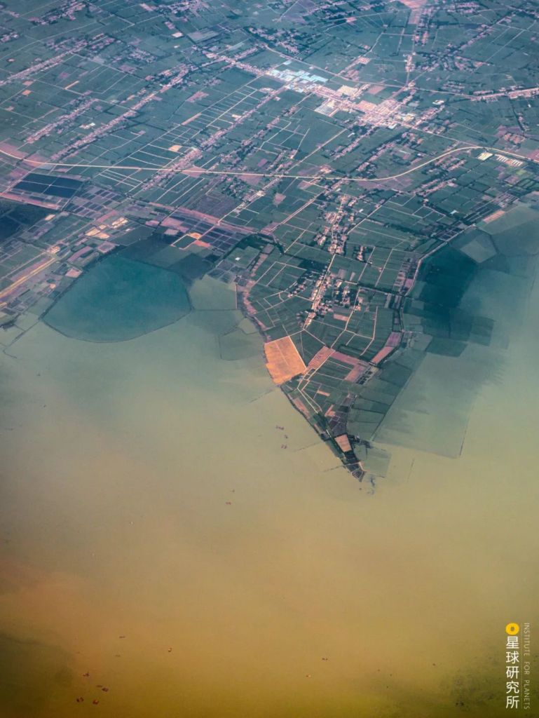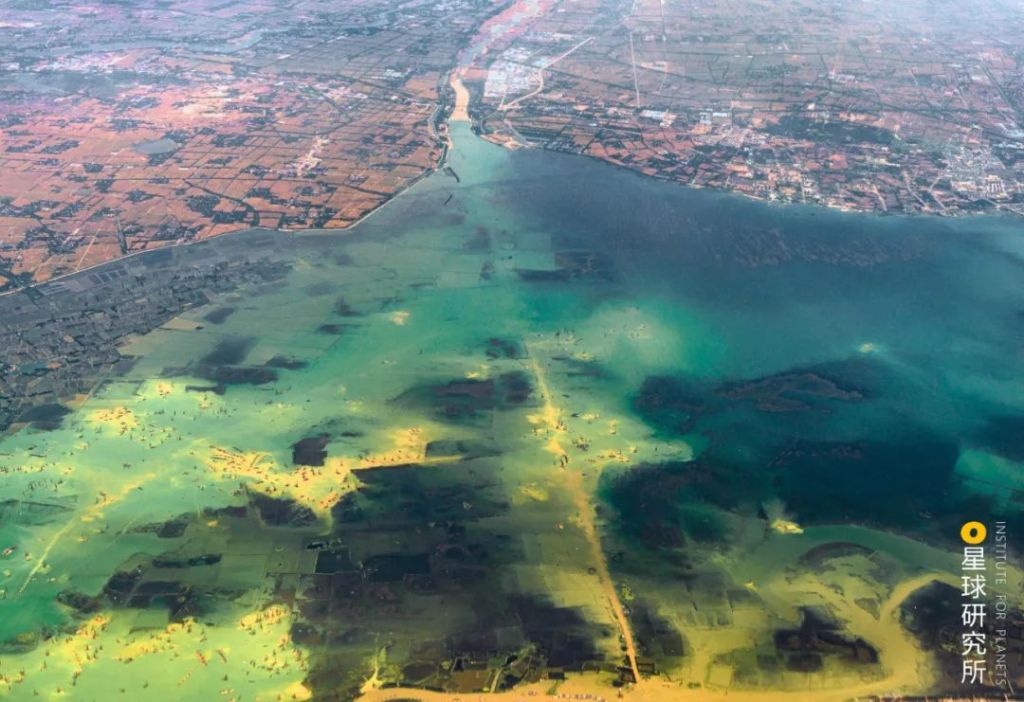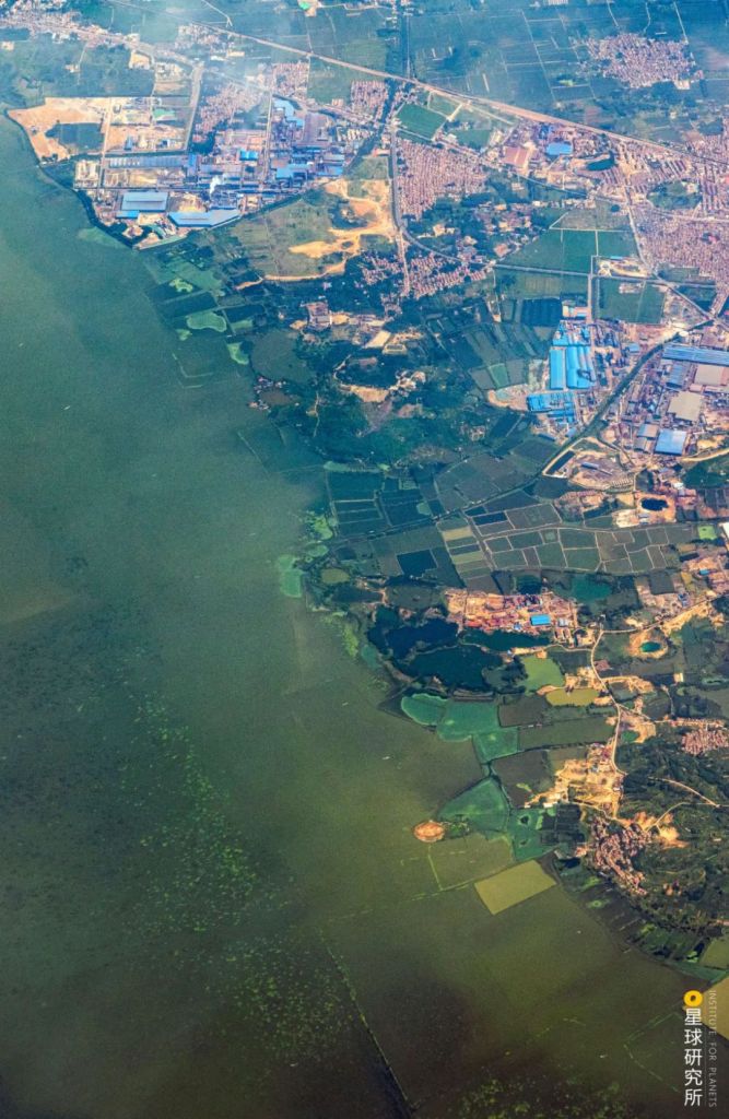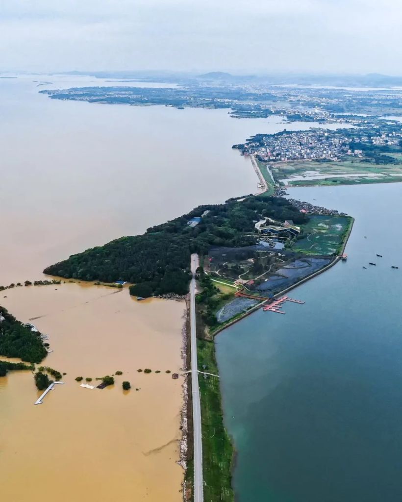 Bottom right is the Kangshan flood retention and detention basin behind the levee, top left is the Poyang Lake