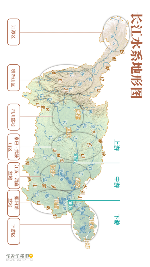 Headwater region (江源区), Hengduan Mountains (横断山区), Sichuan basin (四川盆地), Qinba-Wuling Mountains (秦巴-武陵山区), Jianghan-Dongting basin (江汉-洞庭盆地), Poyang Lake basin (鄱阳湖盆地), downstream region (下游区)