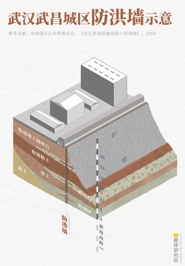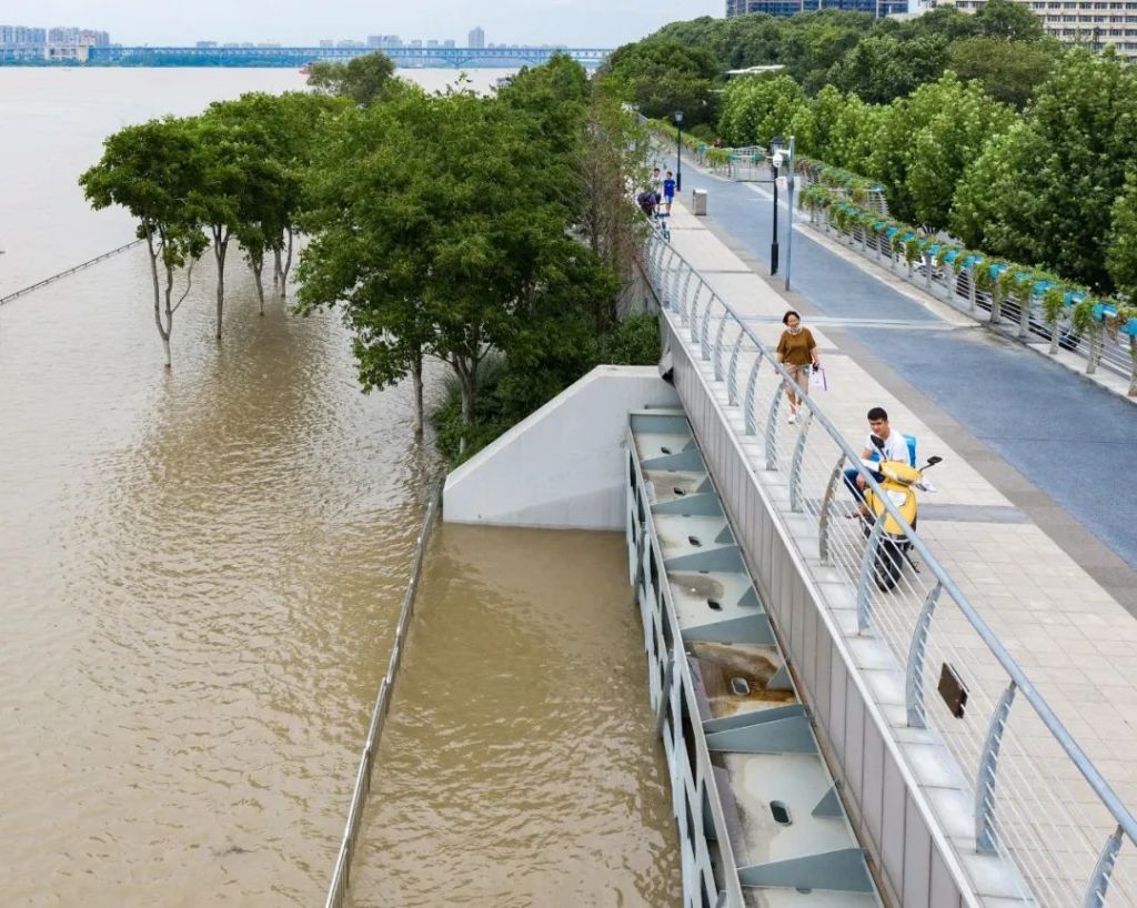 And for Wuhan, which has two rivers and faces four river banks, the urban area is too close to the water to provide sufficient space for levee construction, hence limiting the height of levees. Engineers can only add a flood wall on top of the existing soil embankment.